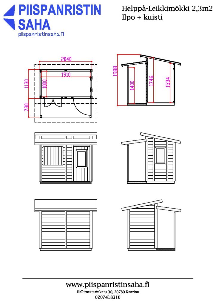 Tutustu kattavaan mallistoomme, josta löydät monipuolisesti kaikki leikkimökit ja muutkin piharakennukset. Jokainen piharakennuksemme on tilattavissa edullisesti ja nopealla toimituksella suoraan kotiisi. Mallimme on helppo koota valmiiksi saakka omin voimin, mutta tarpeen vaatiessa voit tilata meiltä myös avaimet käteen -palvelun ja pystytysapua. Mikäli juuri Helppå-Leikkimökki Ilpo + kuisti ei sovellu tarpeisiisi, löytyy valmiista valikoimastamme muita hyviä ratkaisuja. Muista myös, että voit ottaa yhteyttä ja kysyä suunnittelupalvelustamme juuri sinulle sopivaa pakettia, sillä jokainen piharakennuksemme on mahdollista räätälöidä tarpeen mukaan!