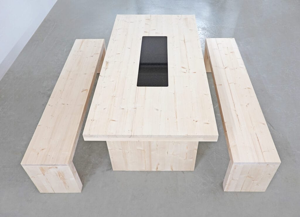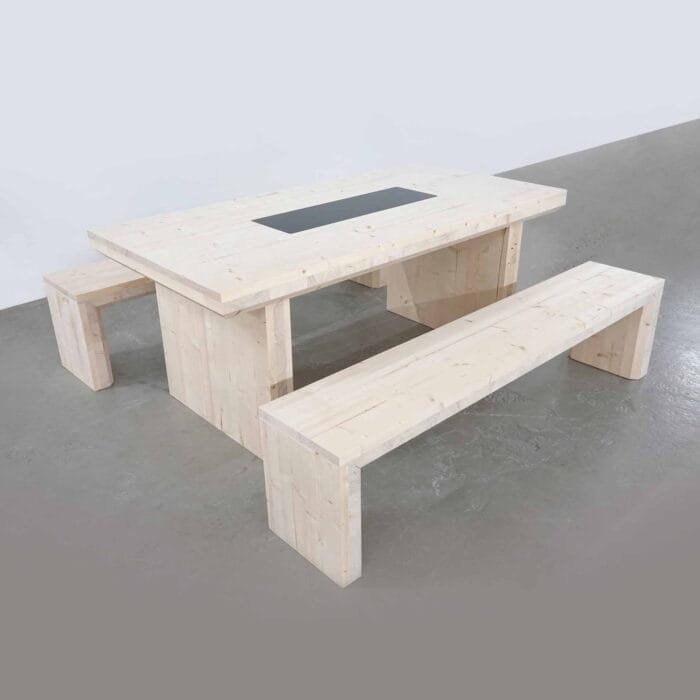 CLT-puulevystä valmistetut Massiivi-kalusteet sopivat sekä sisä-, että ulkokäyttöön. Pöydän kannen vakiokoko L-mallissa on 900 x 1600 mm ja CLT-materiaalin vahvuus 90/100 mm. Tyylikkään puupöydän kanteen on upotettu aito kotimainen kivilevy, joka soveltuu alustaksi esim. kuumille astioille.