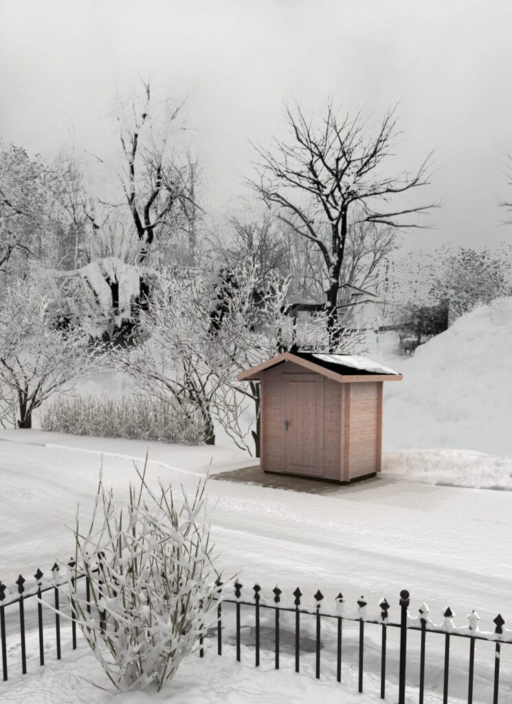 Perinteikäs hirsinen pihavarasto harjakatolla. Kevythirsivarastot kootaan perinteiseen tapaan yksittäisistä 45 millin paksuisista kevythirsilaudoista rakentamalla.