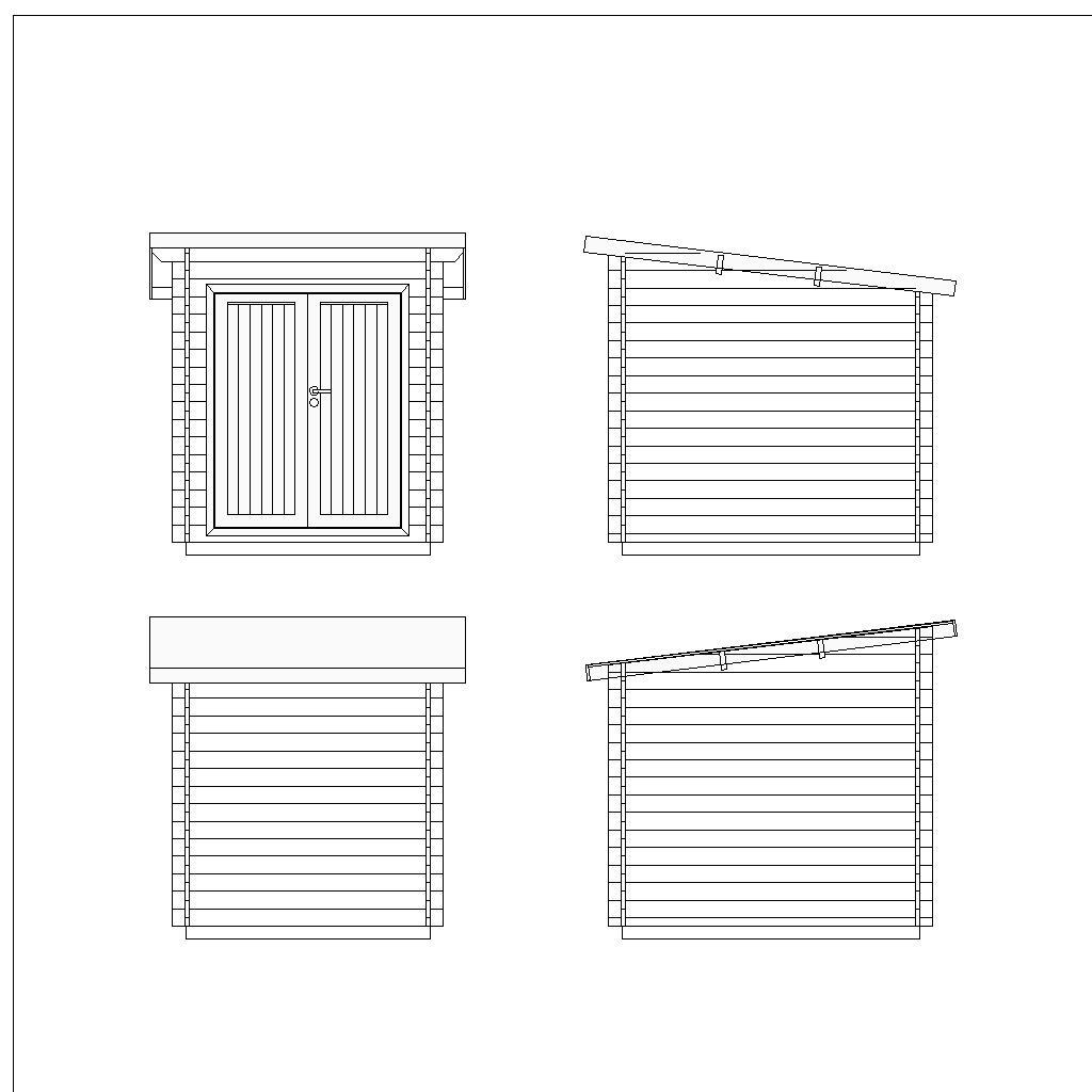 Moderni hirsinen pihavarasto 45mm hirrestä lapekatolla. Kevythirsivarastot kootaan perinteiseen tapaan yksittäisistä 45 millin paksuisista kevythirsilaudoista rakentamalla.
