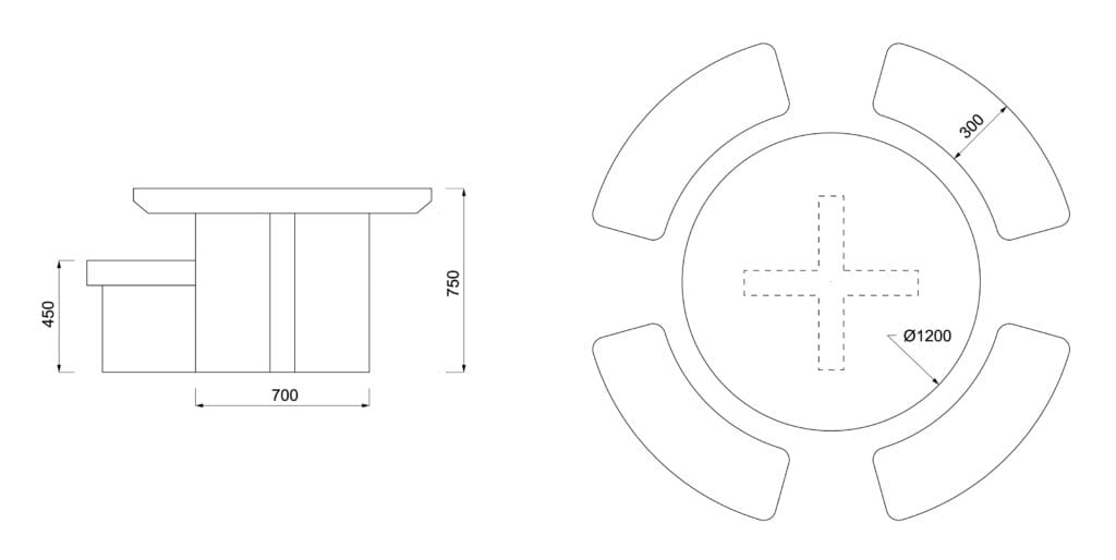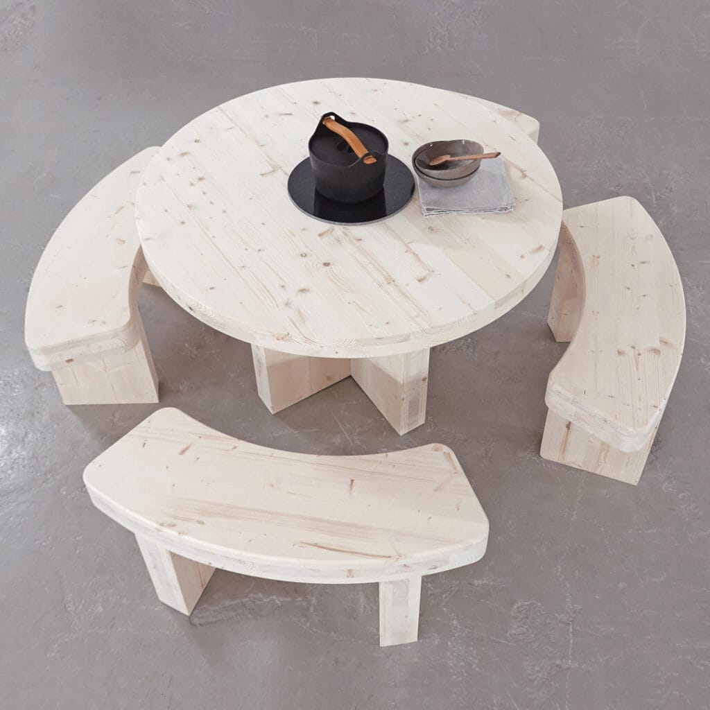Pyöreä Plus-puupöytä on ihanteellinen piha- tai patiopöytä yhdessä ruokailuun ja ajanviettoon. CLT-massiivipuusta valmistettu pöytä on saanut nimensä plussan muotoisesta jalasta, joka jättää istujille hyvin jalkatilaa. Pöydän vakiohalkaisija on 1200 mm, mutta myös muut dimensiot ovat erikoistilauksesta mahdollisia. Puumateriaalin vahvuus 90/100 mm ja pöydän kannen alareunassa on ilmettä keventävä viiste.