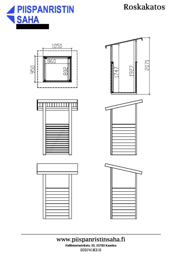 Laadukkaat ja siistit jäteastiasuojat ja -katokset valmistetaan käyttäen kestävää kotimaista puuta. Saatavana myös lattialla, ei sisälly hintaan. Lattiapaketin löydät Muut tuotteet– valikosta.