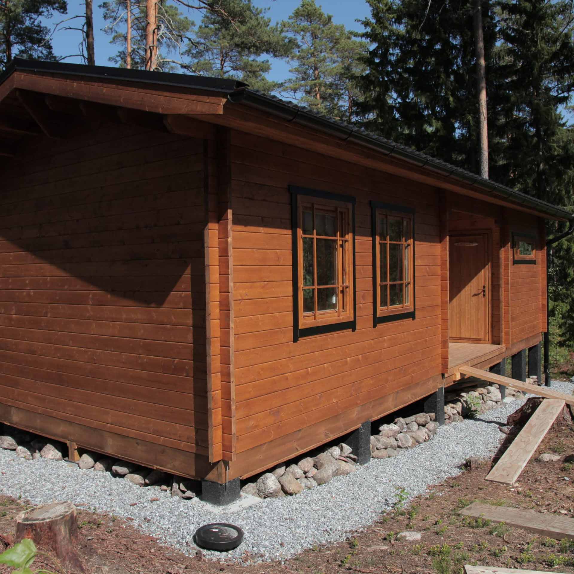 Pietari on kevythirsimallistomme suurin sauna ja vierasmaja tyylikkäästi yhdistettynä. Rakennuksen keskiosassa kulkee tilava ja katettu 12m² terassi, jonka voi tarpeen vaatiessa vaikka lasittaa. Vierashuoneen neljän ikkunan valoisa ja 18m² tila sekä sauna erillisine pukuhuoneineen tarjoaa ruhtinaalliset tilat mökkivieraiden käyttöön. Saunamallistomme lippulaiva tarjoaa ajattoman tyylikkään ulkoasun ja runsaasti monipuolista tilaa tekemiselle kuin tekemiselle.
