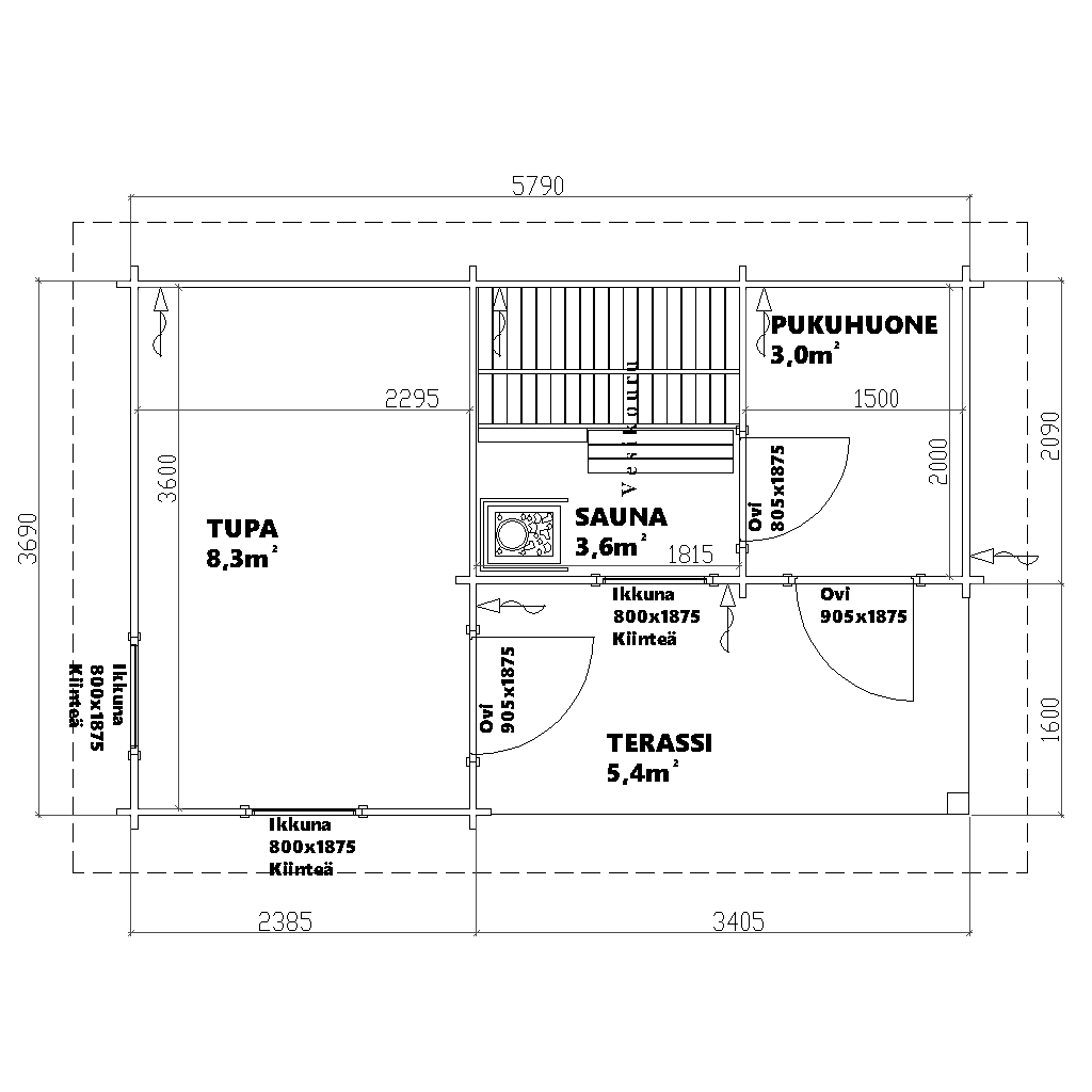 Sauna Sofia on moderni saunamökki, joka on valmistettu 45mm kevythirrestä. Viistokattoinen ja hillityn moderni ulkoasu runsaine ikkunapintoineen ja katettuine terasseineen tekee Sofiasta tyylikkään ja kokoonsa nähden tilavan ja ilmavan ratkaisun. Rakennuksessa löytyy oma huone saunomiseen, vaatteiden vaihtoon sekä lisäksi vielä oma erillinen oleskeluhuone.